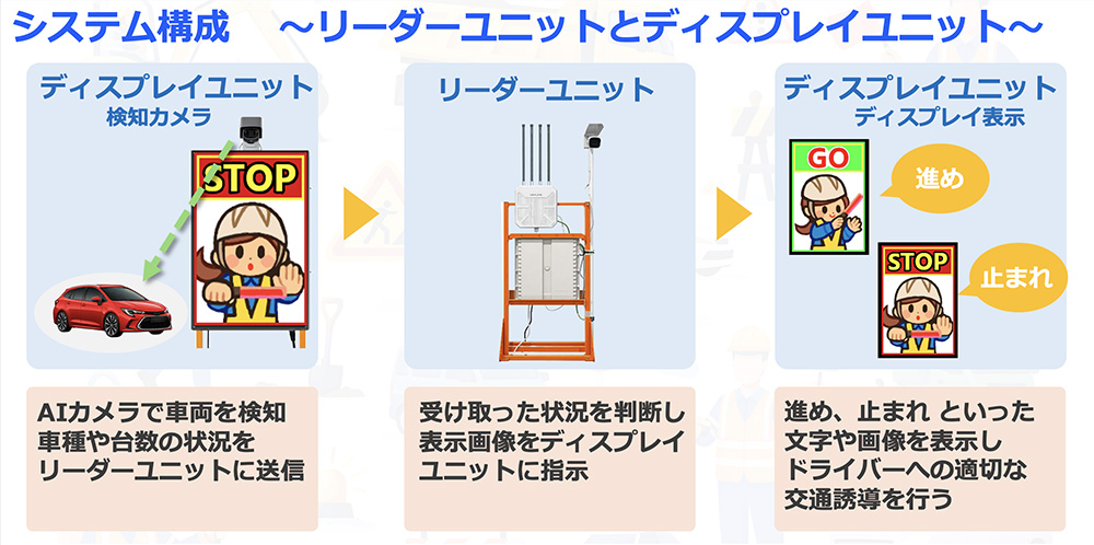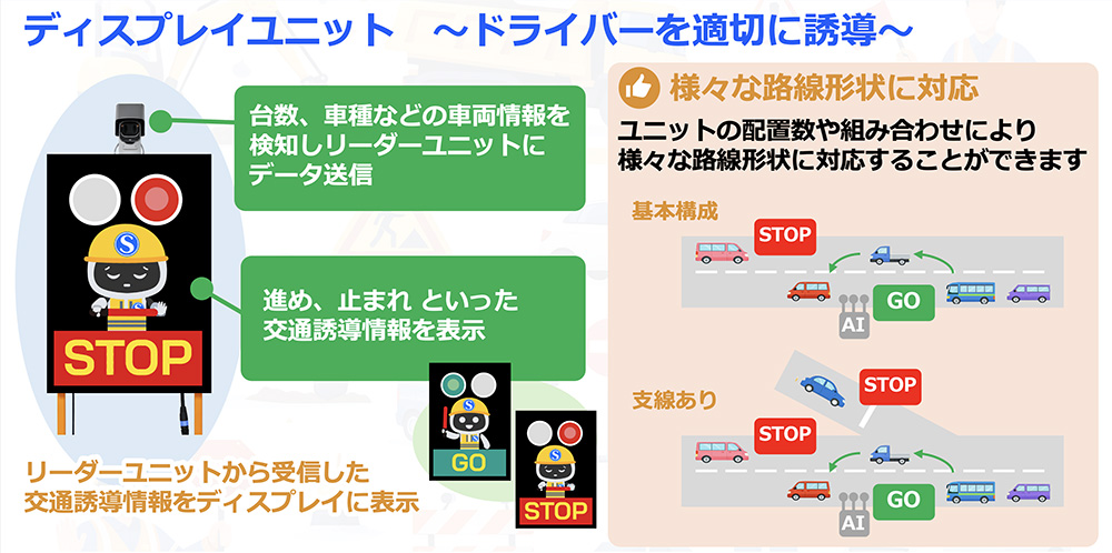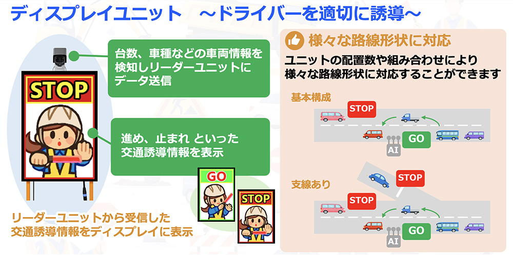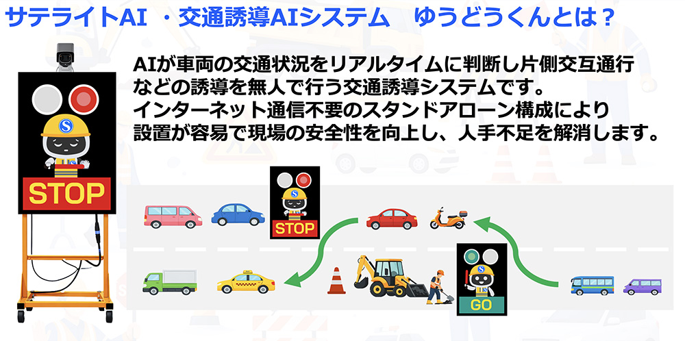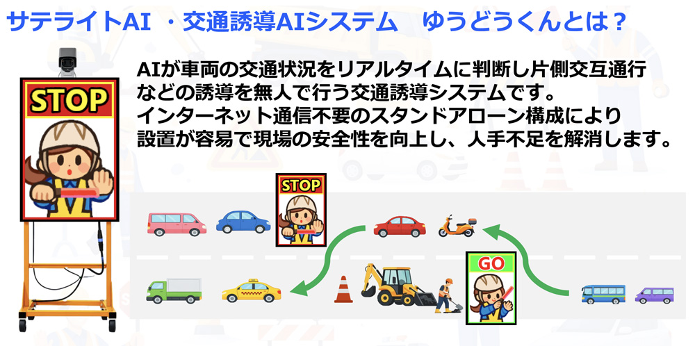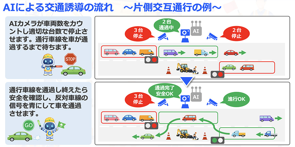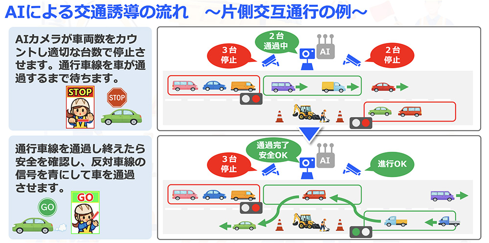 AIが車両の交通状況をリアルタイムに判断し片側交互通行などの誘導を無人で行う交通誘導システムです。