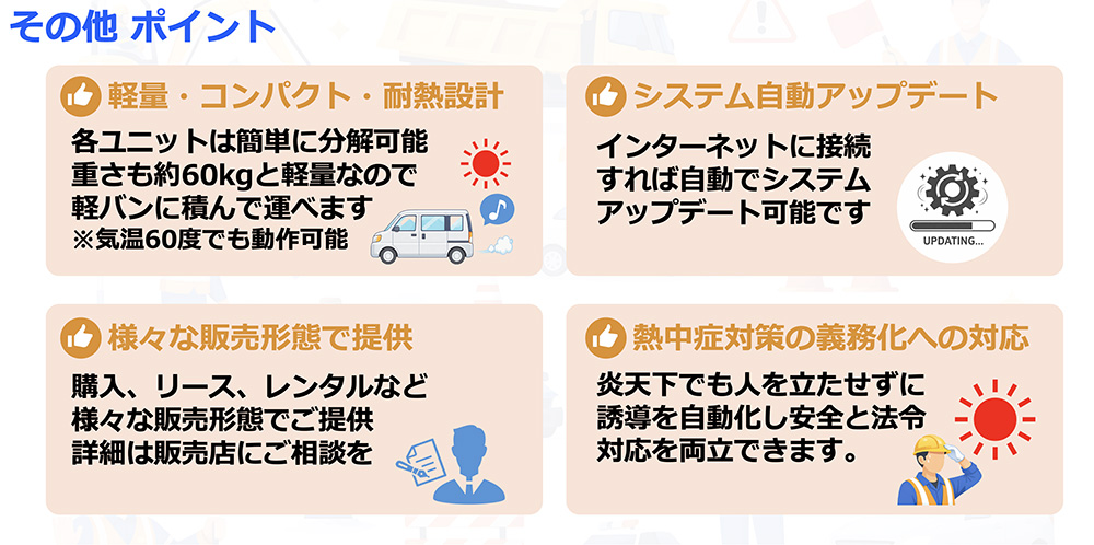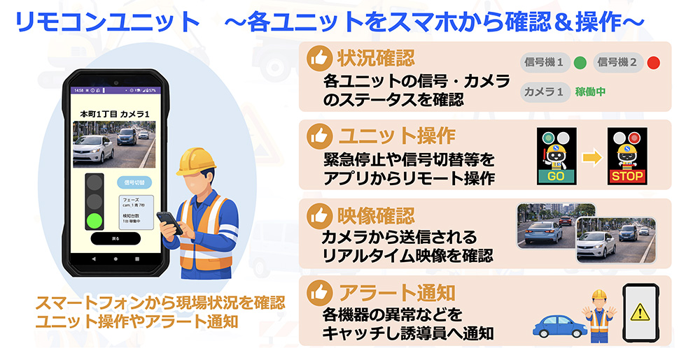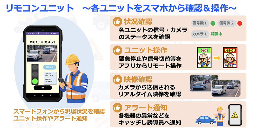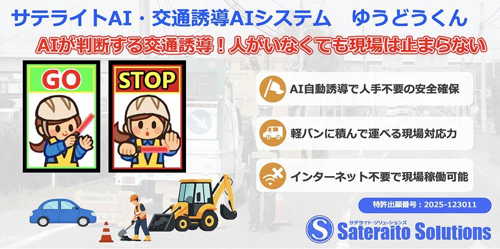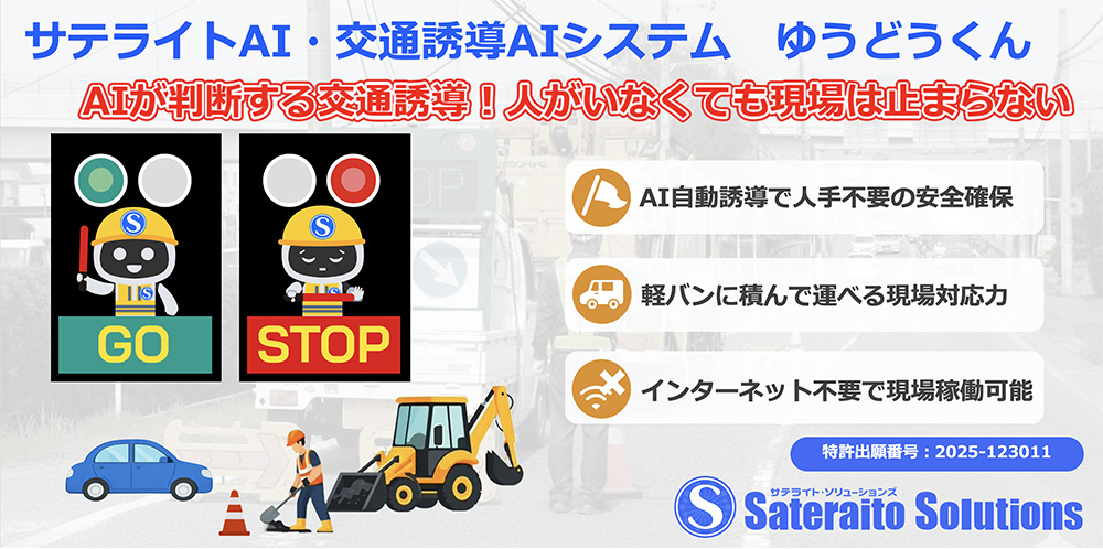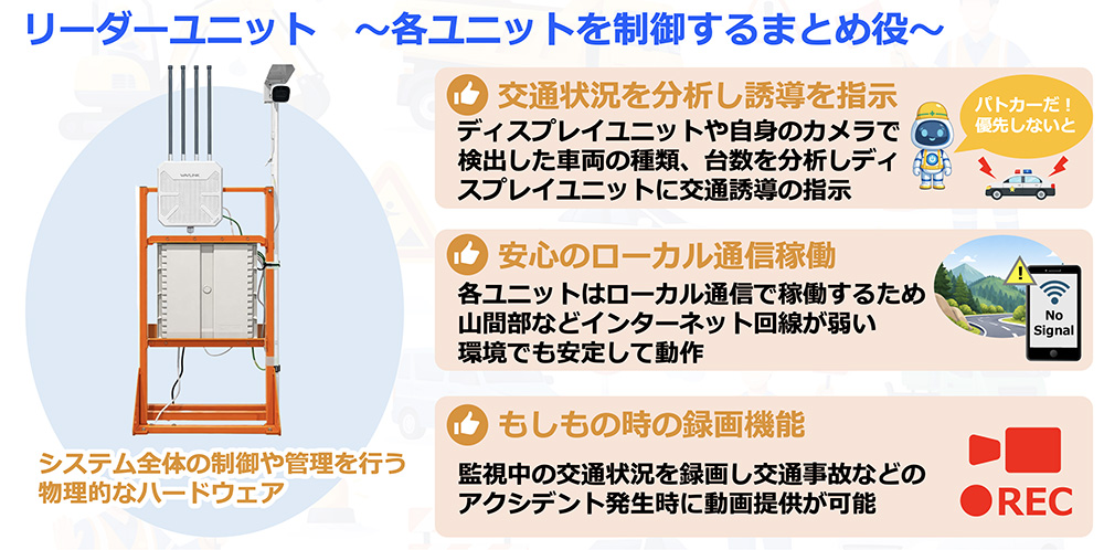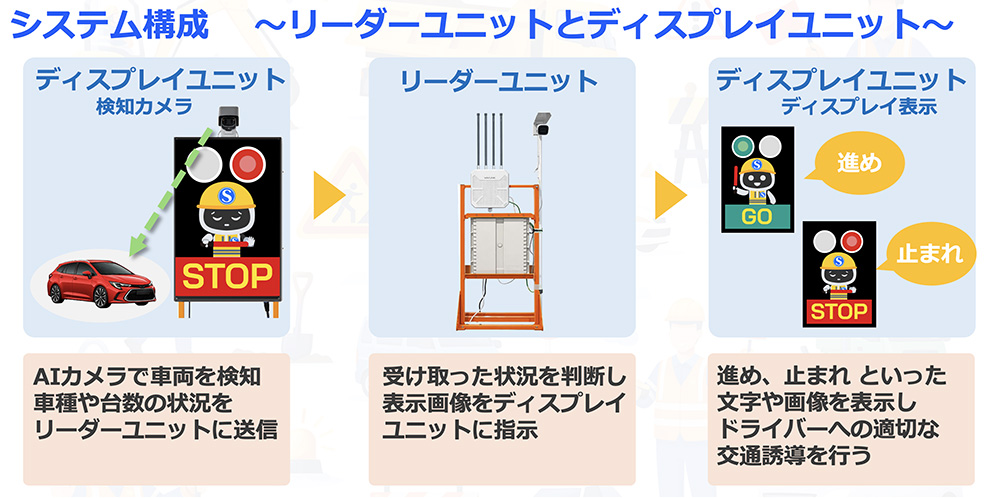 AIが車両の交通状況をリアルタイムに判断し片側交互通行などの誘導を無人で行う交通誘導システムです。